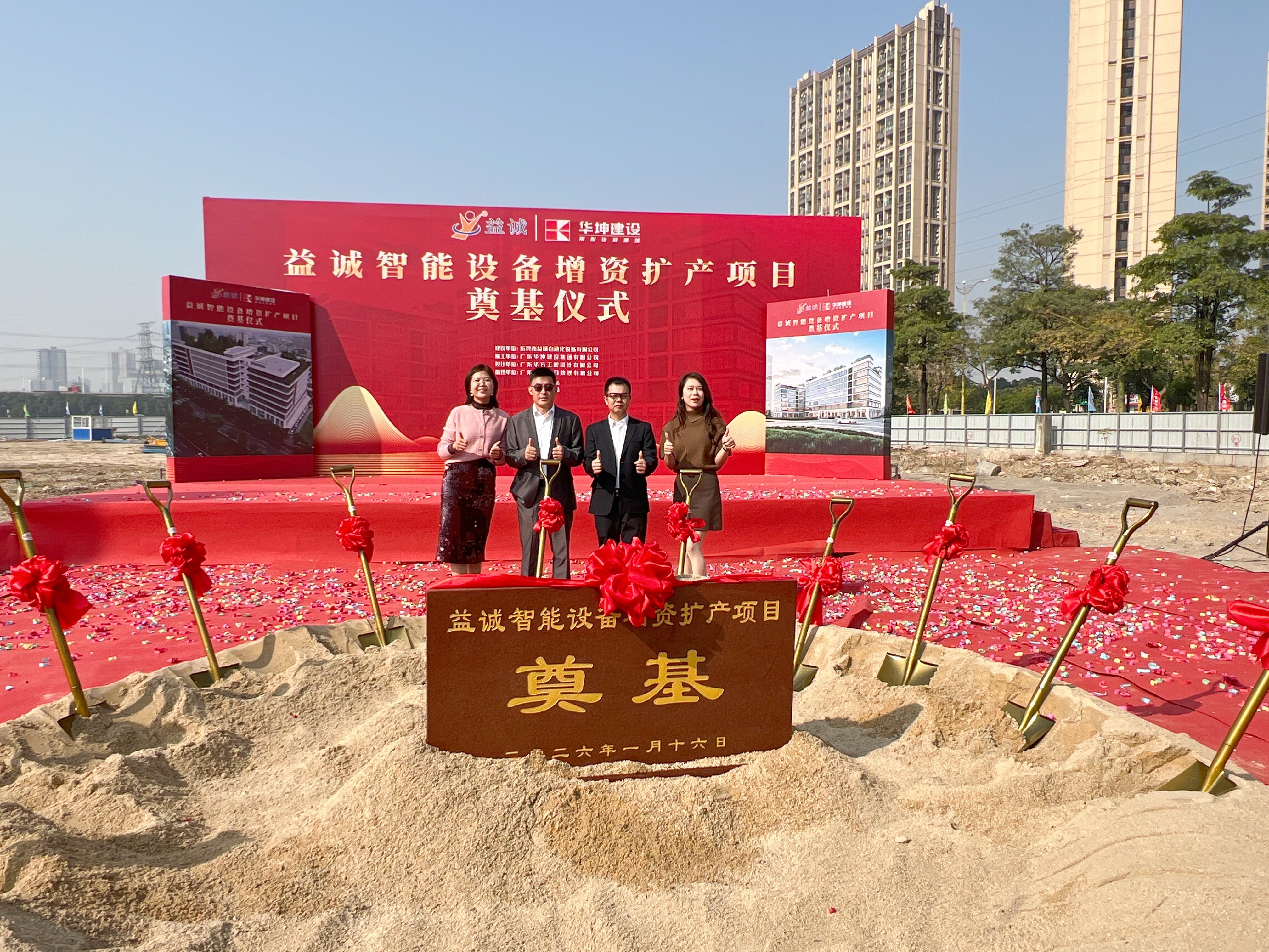 2026年1月16日,艷陽高照,晴空萬里。在這充滿希望與激情的季節(jié),益誠智能設(shè)備增資擴(kuò)產(chǎn)項目奠基儀式隆重舉行。益誠自動化董事長袁董、總經(jīng)理潘總攜眾高管與本項目的設(shè)計方、施工方、監(jiān)理方等參建單位代表齊聚一堂,共同見證這一具有里程碑意義的盛典,現(xiàn)場氣氛熱烈非凡。